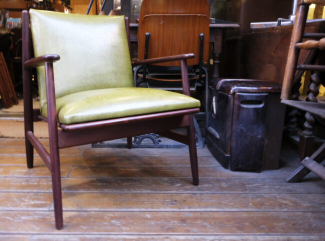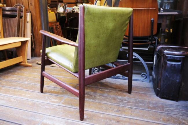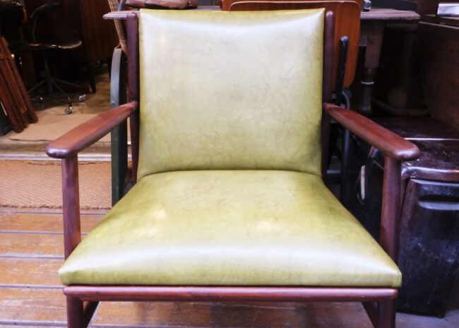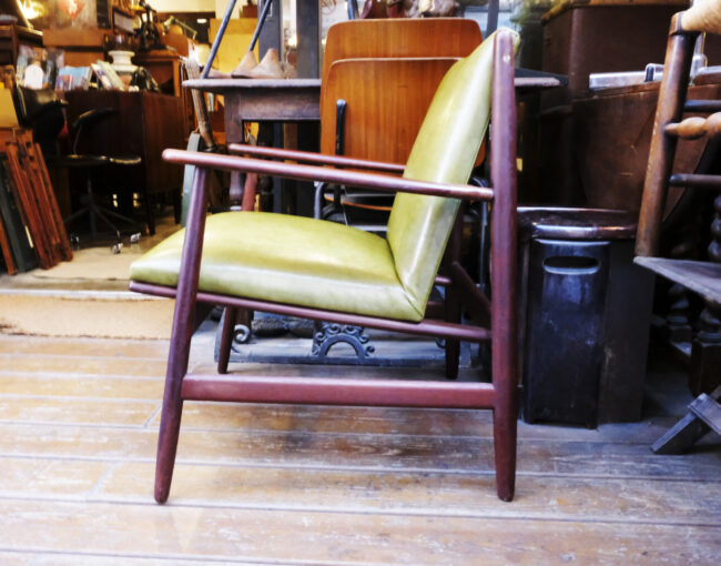 坐-丹麥綠皮 柚木扶手蒙皮 單人沙發 休閒椅